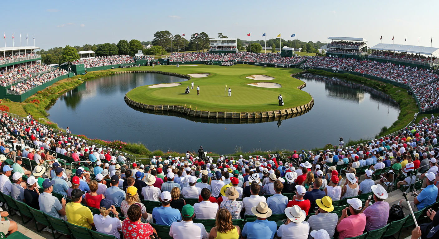 An unexpected by-product of the lake construction was the island green at the 17th hole. What was originally designed as a small pond near the green continued to be dug for the valuable sand base found in that area. After the excavation work, nearly all of the area around the green was surrounded by water. Now it is perhaps the most famous par-3 in the world. Today up to 36,000 fans can watch from this hole!