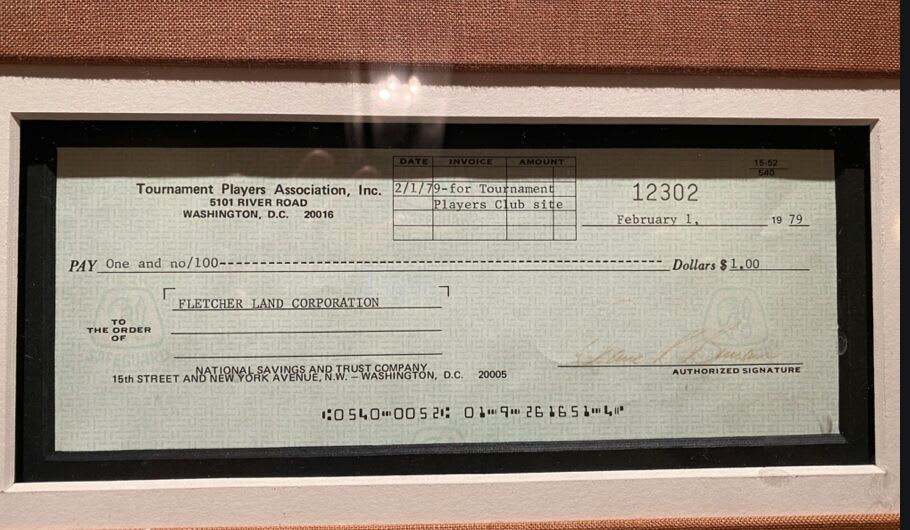 should not have placed that bet!! Determined, Beman sought other options to stay in Ponte Vedra Beach. He soon found allies in Jerome and Paul Fletcher, major landowners in the area. They believed in the dream so much that they eventually sold 415 acres of wooded wetlands and swamp to the PGA TOUR for $1. That $1 check is ALSO on the walls of the amazing clubhouse in a framed picture
