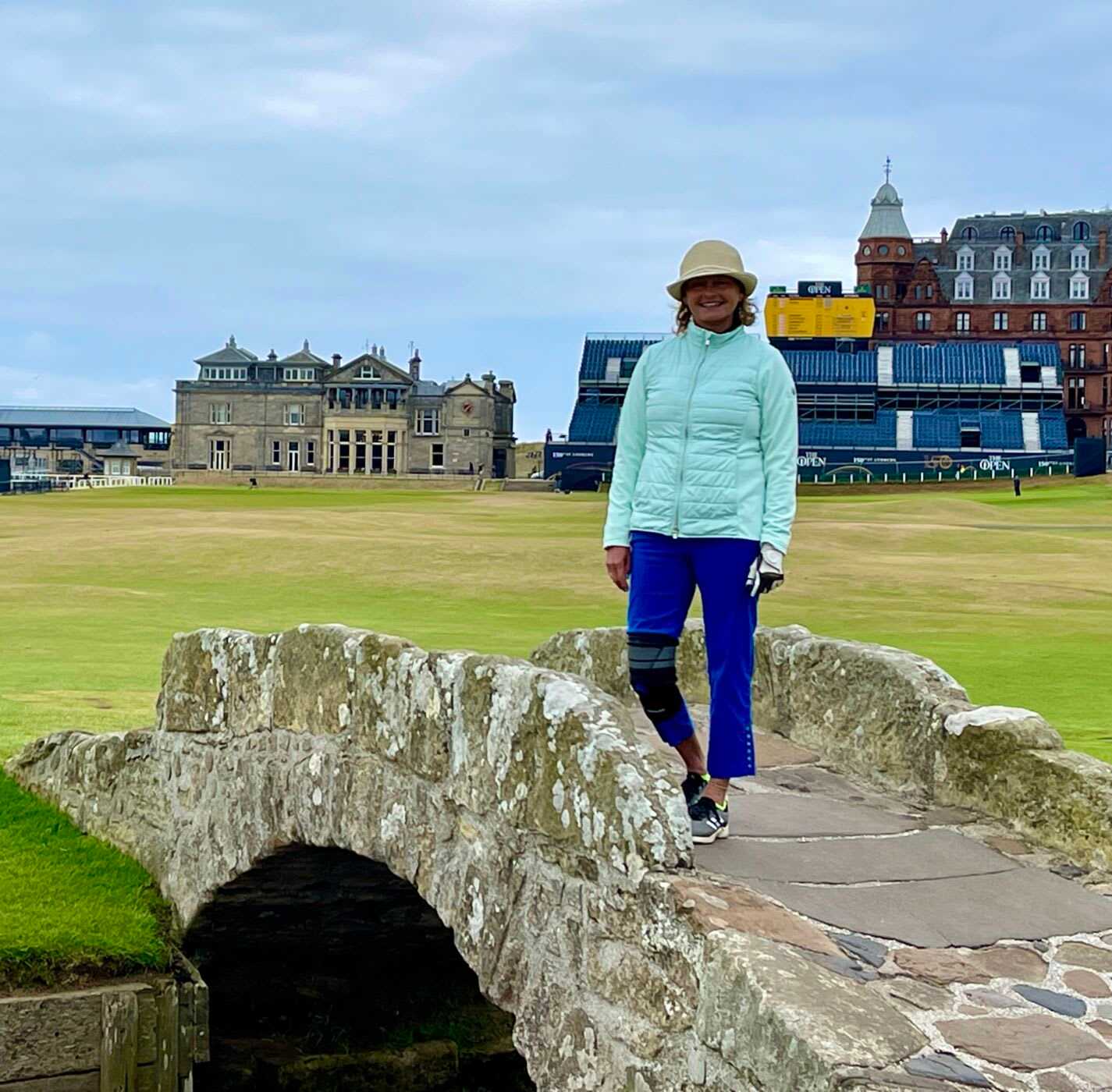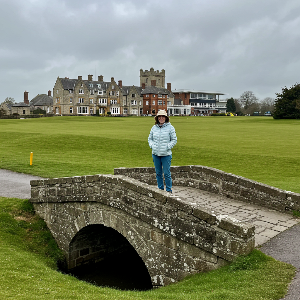 at least 700 years ago to help shepherds get livestock across, it has the modern photographic advantage of great backdrops on three sides: the course’s grand Royal and Ancient Clubhouse on one, often a packed grandstand of enthusiasts on another, and rolling hills facing toward the North Sea and the beach, on the last. I am guessing it has to be one of the most photographed golf photos for ANY golfer pro or amateur! It was a thrill to stand on it and get my photo taken! So are you ready to play THE OLD COURSE yet? I’ll go back and play it with you ANY TIME!