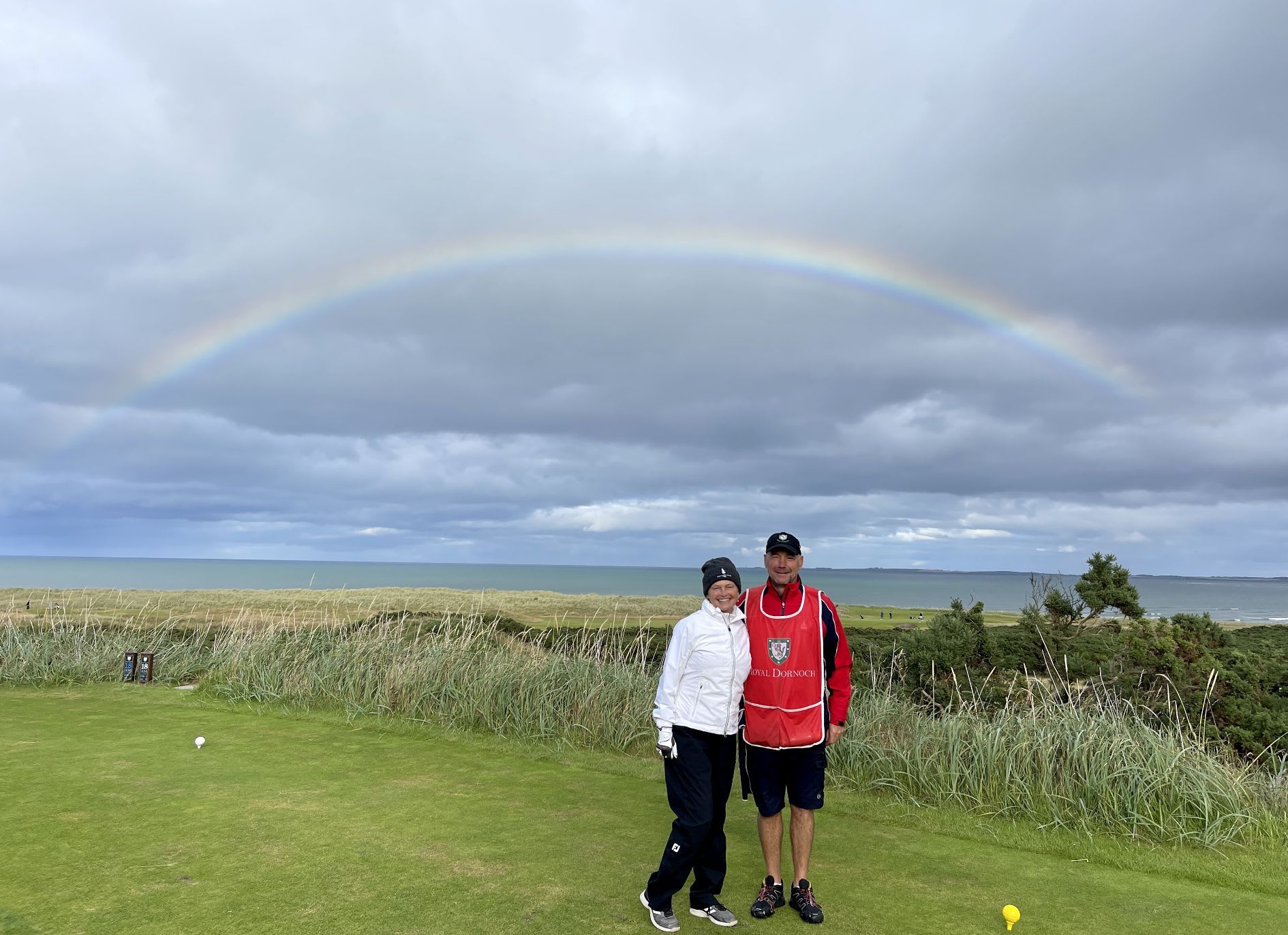 occurs at the 9th and runs along the water for the majority of the back nine. 17 and 18 come inland and could be considered connecting holes but, I actually really enjoyed the drama of the cliff like drop in the middle of the 17th fairway and the HUGE green on 18 that is cleverly disguized from the fairway. In summary, this is links golf in its most pure form. PERIOD! A stern but fair test that particularly examines your short game and your ability to miss in the right place. It just may be the best course I have ever played and one I could happily play every day for the rest of my time. A truly remarkable golf course. I can’t wait to go back and play it again! And where in the world can you find a course with a rainbow watching after you .this was after my 3rd birdie with my lucky caddie!
