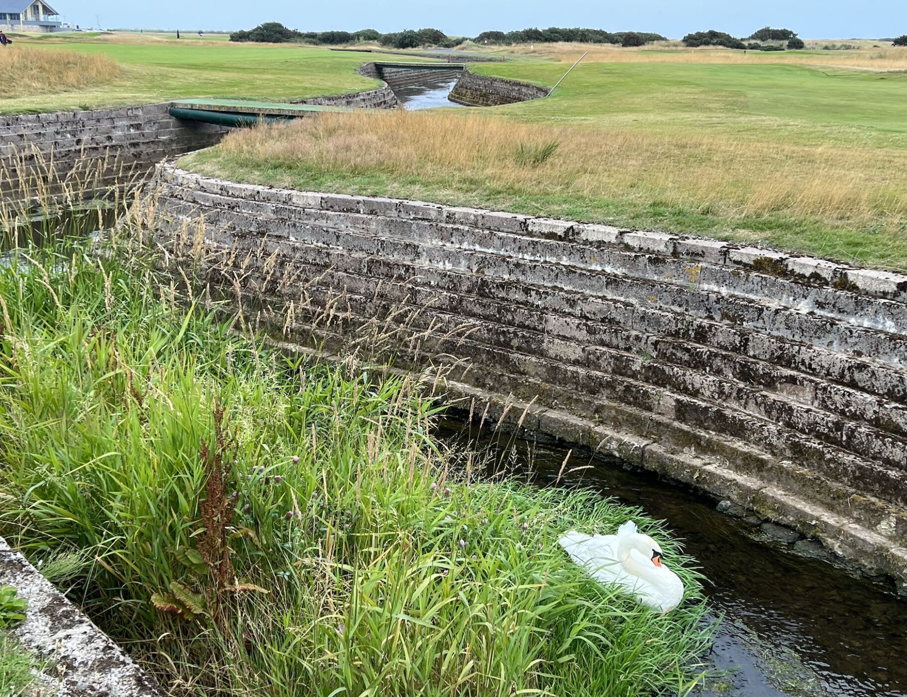 (see the picture in my blog with the swan in the burn), Carnoustie has some of the most formidable bunkers to contend with. There’s a plethora of them and some are more like “caverns”. I was in a few of them! The par five 6th measures 520 yards from the white tees and is regarded as one of the world’s best holes. Named, “Hogan’s Alley, after the immortal Ben Hogan who won the Open Championship in 1953. Two fearsome looking bunkers lie waiting in the middle of the fairway and a third bunker to the right hand side ensures that the tee shot is daunting. In my opinion ALL tee shots are daunting at Carnoustie!